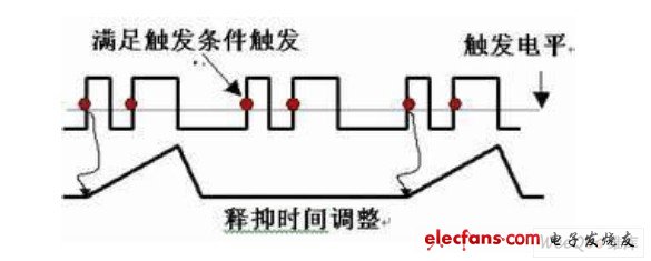 Holdoff(触发释抑)的含义是暂时将示波器的触发电路封闭一段时间(即释抑时间), 在这段时间内,即使有满足触发条件的信号波形点示波器也不会触发。在数字示波器中也会 用百分比来表示,意义是整个记录长度或者整个屏幕的百分比。