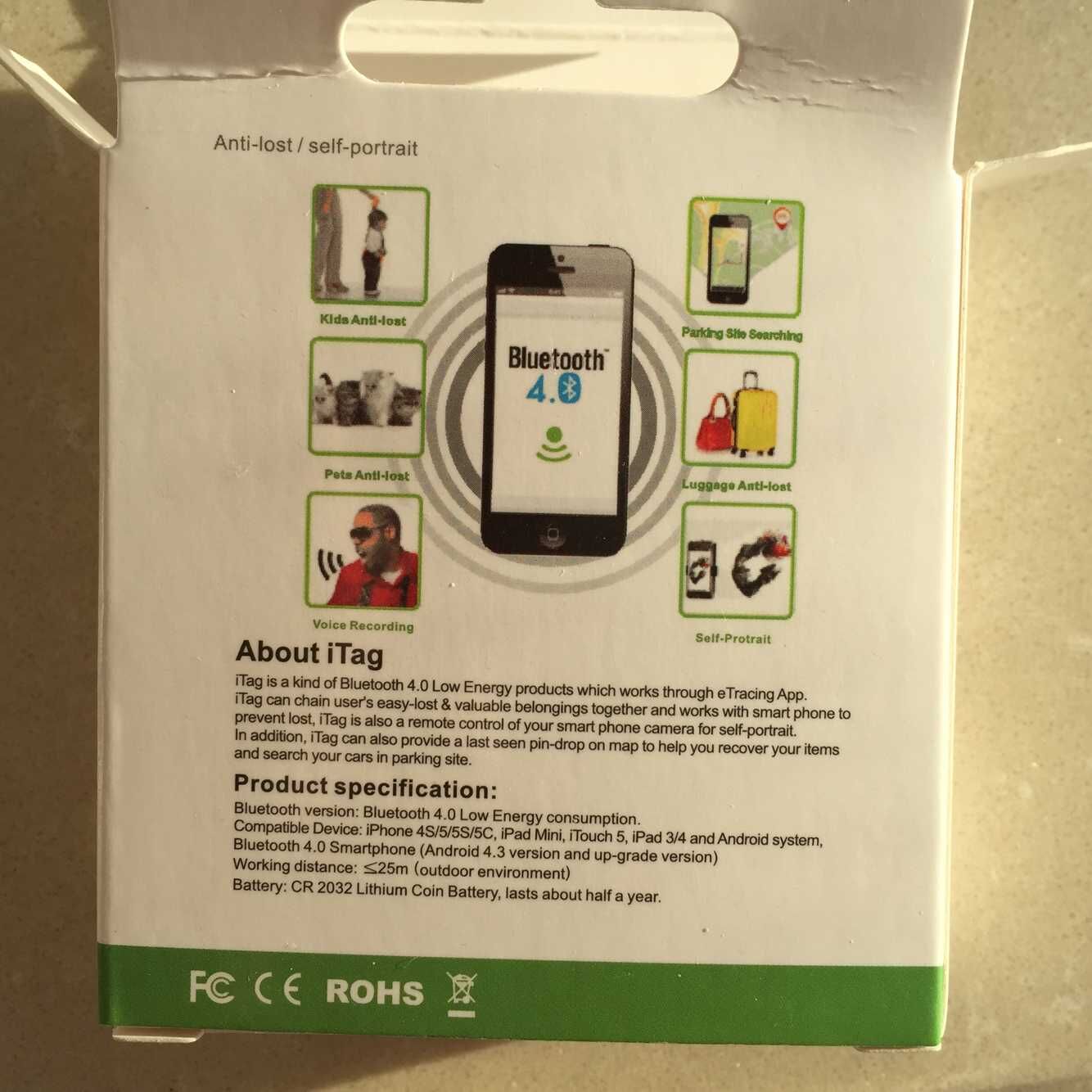 Itag is a kind of bluetooth 4.0 low energy products which works through a Itracing App.Itag can chain user's easy-lost & valuable belongs together and works with smart phone to prevent lost.